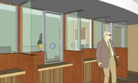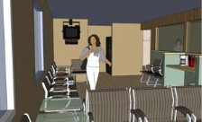 New, clearly separated reception and enlarged waiting areas will minimize hallway congestion, ensure patient privacy, and occupant safety by utilizing individual check-in stations and bullet resistant transaction windows with deal trays. The configuration of the reception allows for complete surveillance of the waiting areas, entry courtyard, and vestibule. The waiting area spotlights a coffee bar, private “My-Vet” computer station, vending area, additional natural lighting from new windows, and Veteran created memorabilia tack board.
